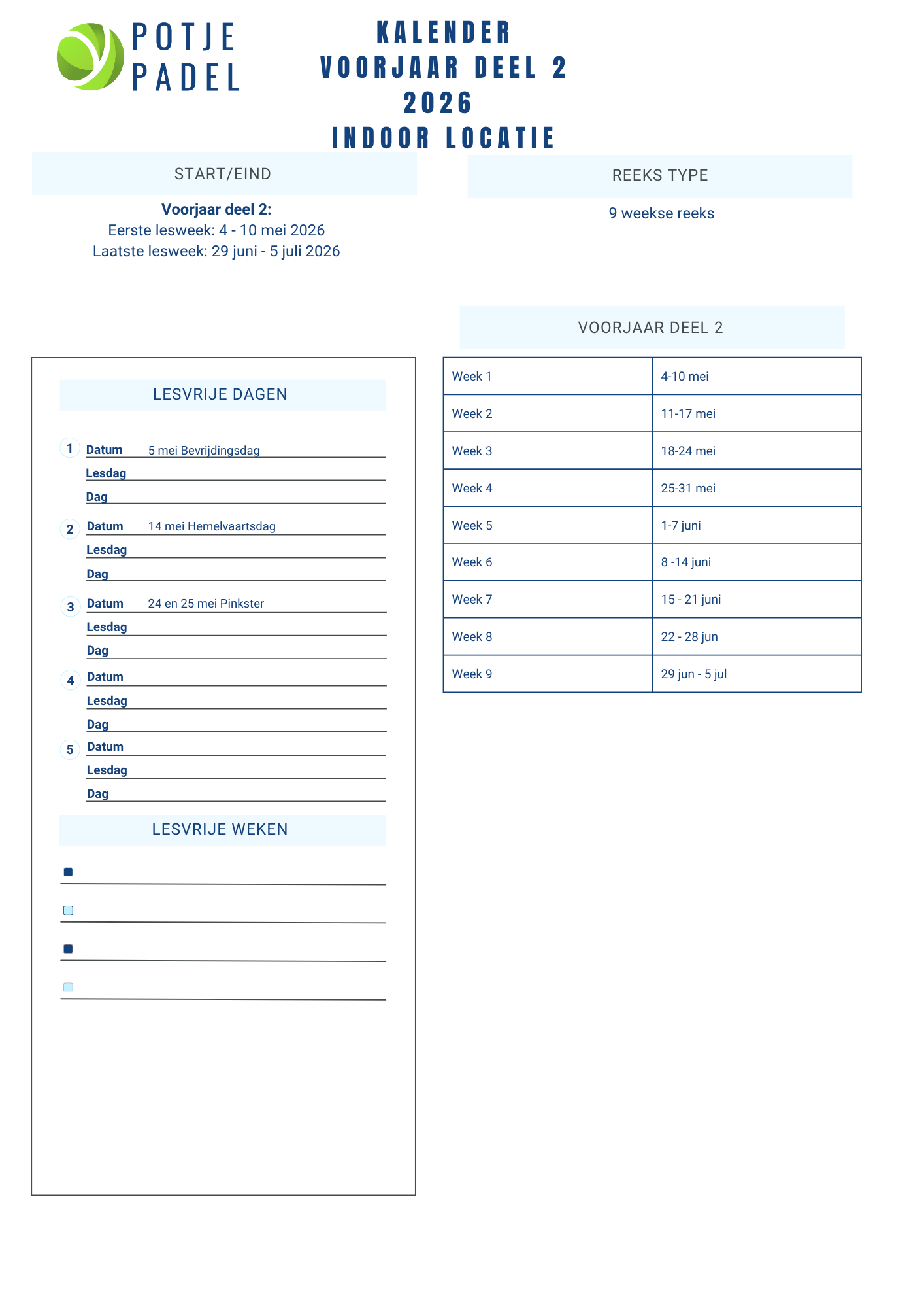De planning van de reguliere lessen zal 1 a 2 weken voor de start van de reeks bekend gemaakt worden via de mail.